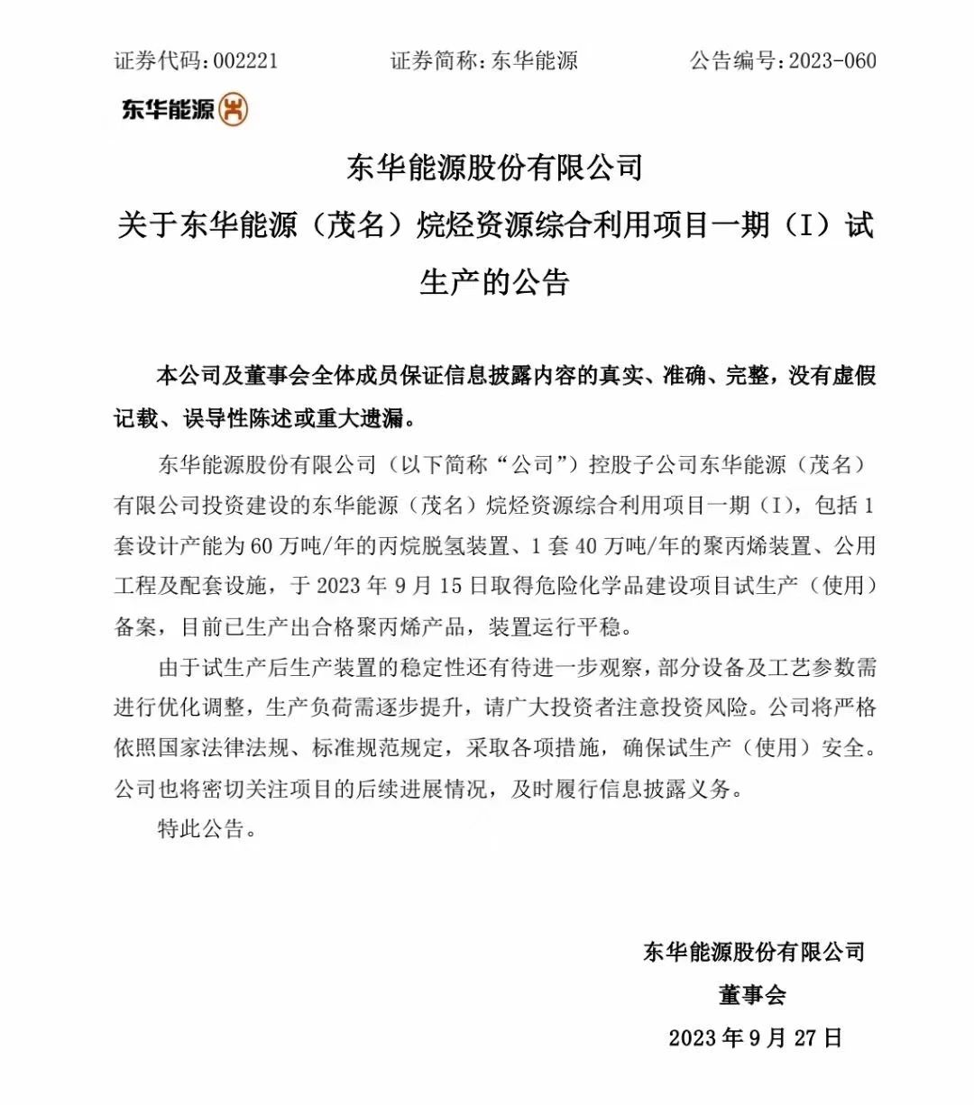 9月27日,东华能源发布公告称,东华能源(茂名)烷资源综合利用项目一期(I),包括1套设计产能为60万吨/年的丙烷脱氢装置、1套40万吨/年的聚丙烯装置、公用工程及配套设施,于2023年9月15日取得危险化学品建设项目试生产(使用)备案,目前已生产出合格聚丙烯产品,装置运行平稳。