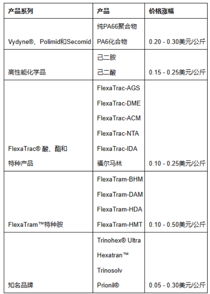 10月6日消息,全球知名的大型一体化PA66产品系列生产商Ascend Performance Materials(奥升德)宣布,由于投入成本大幅增加,在合同允许的情况下,全球价格上调如下: