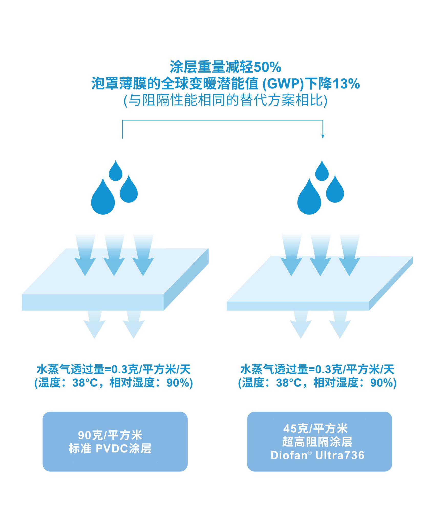 与现有的中高阻隔PVDC 涂层相比,Diofan® Ultra736 的阻隔性能表现更为出色,可以在保证功能性的前提下打造更薄的涂层结构。更值得一提的是,在应用实践中,对于Duplex双层阻隔结构,Diofan® Ultra736 可以在实现底漆层数减半的同时,提供相同的水蒸气阻隔效果。应用这款新型材料有助于将泡罩薄膜成品的碳排放总量减少达13%。[1]