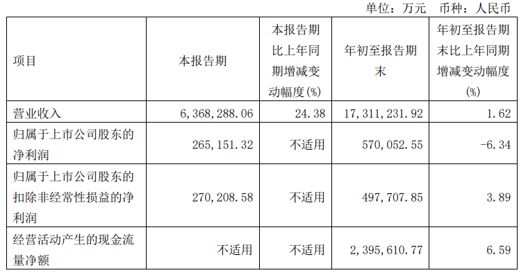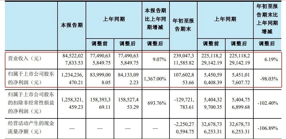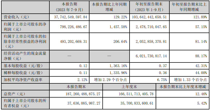 10月28日,东方盛虹发布2023年三季度报。报告显示,2023年第三季度公司主营业务收入377.43亿元,同比上升129.22%;第三季度归属于上市公司股东的净利润7.98亿元,同比增长1457.58%,业绩再创历史新高。