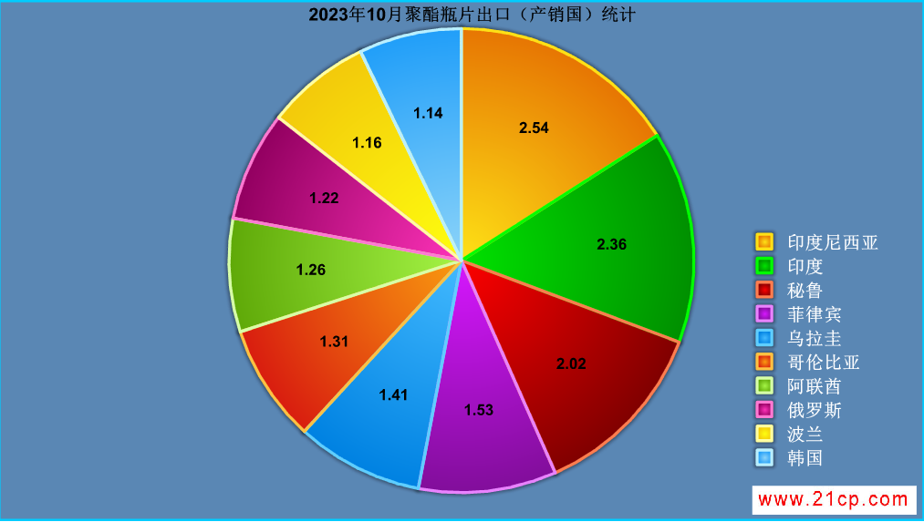 由上图可见,2023年10月聚酯瓶片前十位出口国比起上月有所变动,主要出口国仍以非洲、亚洲地区为主。其中印度尼西亚取代了秘鲁位于第一,出口量为2.54万吨,环比上月增加1.12万吨,占比为15.92%;印度依旧排名第二位,出口量为2.36万吨,环比上月增加0.62万吨,占比为14.80%;秘鲁下降两位排名第三,出口量为2.02万吨,环比上月增加0.21万吨,占比为12.66%。