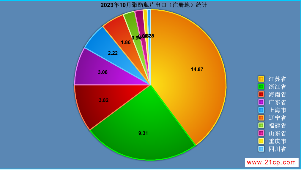 由上图可见,2023年10月聚酯瓶片江苏省仍居于我国聚酯瓶片出口排名的第一省份,出口量为14.87万吨,环比减少5.65%,占国内总出口量的39.82%;浙江省仍居于第二,出口量为9.31万吨,环比增加25.30%,占国内总出口量的24.93%;海南省较上月稳定排名第三,出口量为3.82万吨,环比增加4.95%,占国内总出口量的10.23%。