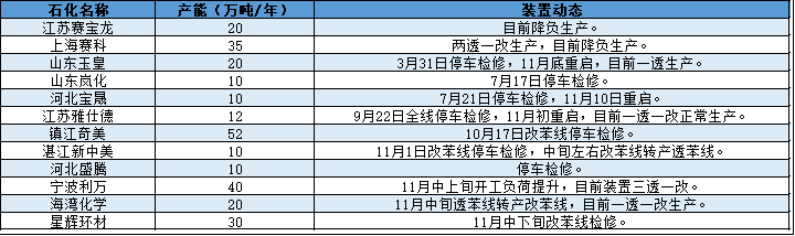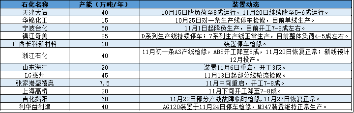 从表1来看,山东海江、张家港盛禧奥、吉化揭阳装置完成检修,实现重启。然受盈利亏损影响,LG甬兴存生产线短暂清洗管道操作,大庆石化、天津大沽、镇江奇美、山东海江、利华益利津出现降负或开工率维持在偏低位,利华益利津AG120本月末出现了停车检修,浙江石化新线投产也已延迟至12月。