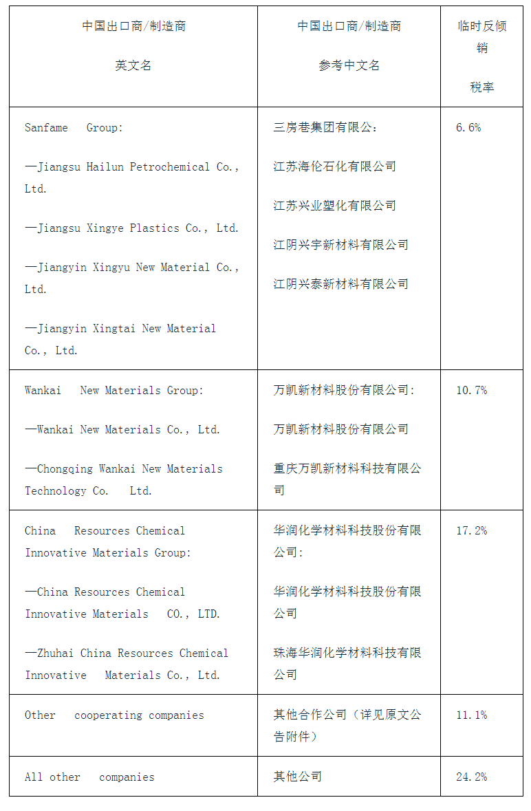 2023年11月28日,欧盟委员会发布公告,对原产于中国的聚对苯二甲酸乙二醇酯(Polyethylene Terephthalate/PET)作出反倾销初裁,初步裁定对涉案产品征收6.6%~24.2%的临时反倾销税,税率详见附表。涉案产品为粘度大于等于78毫升/克的聚对苯二甲酸乙二醇酯。涉案产品的欧盟CN(Combined Nomenclature)编码为39076100。本案倾销调查期为2022年1月1日~2022年12月31日,损害调查期为2019年1月1日~2022年12月31日。措施自公告发布次日起生效,有效期为6个月。