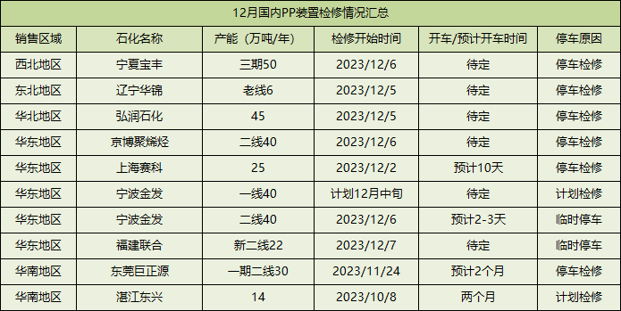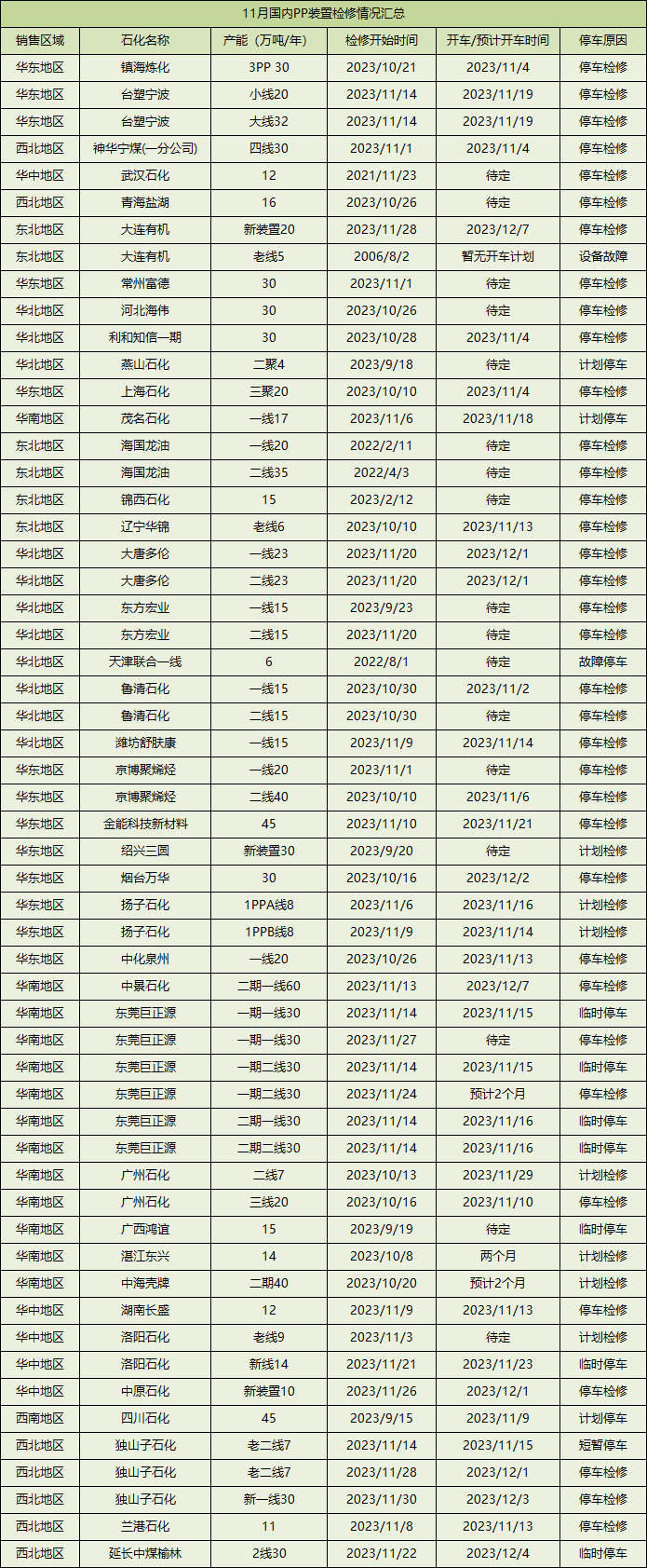 11月份PP装置进入集中检修,共计39家生产厂家、56条生产线停车检修,涉及产能约1211万吨/年。