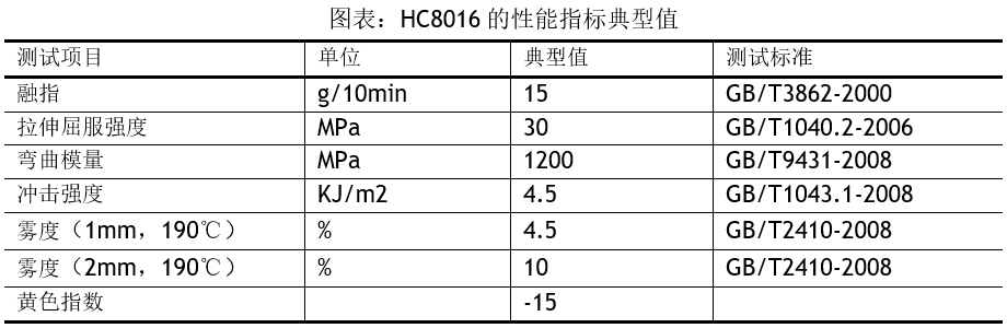 HC8016是一款超透明聚丙烯专用料,与一般超透明料雾度约为5-6相比,通过添加美利肯Millad® NX® 8000透明剂,HC8016的雾度仅为4-4.5(1mm厚样片),使聚丙烯专用料接近玻璃般透明。同时,这一产品具有良好的抗冲性能,弯曲模量为1200MPa,冲击强度达到4.5KJ/m2。除了有高透明、高抗冲、高流动等特性外,在塑料制品加工过程中,HC8016有助于提高生产效率,降低加工温度,从而减少生产过程中的能耗,缩短加工周期。(以下图表为HC8016的性能指标典型值)