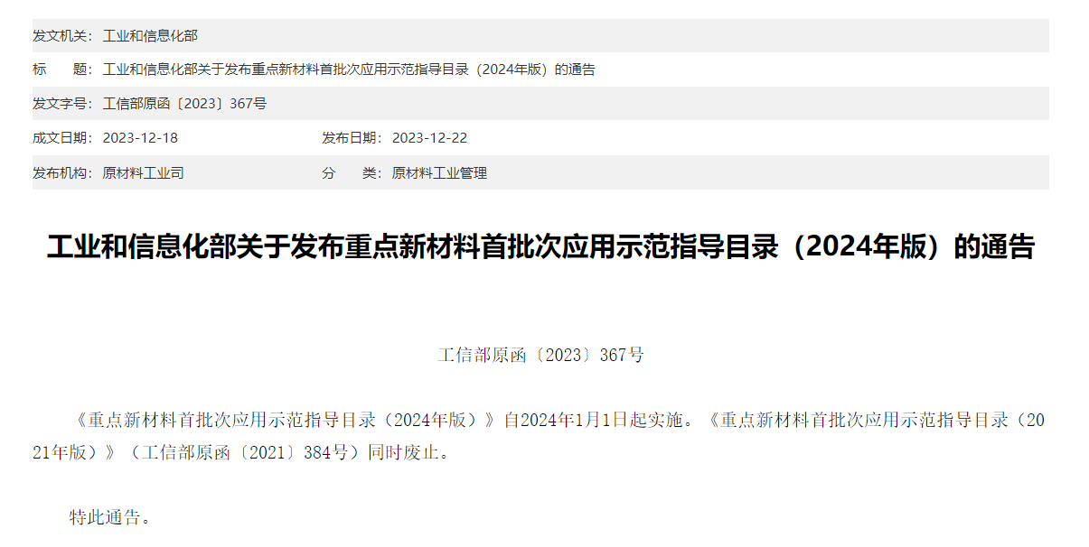 12月22日,工业和信息化部发布《工业和信息化部关于发布重点新材料首批次应用示范指导目录(2024年版)的通告》。
