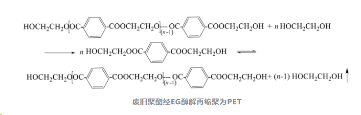将带有颜色的废旧聚酯服装预清洗后,用EG醇解制得对苯二甲酸乙二醇酯(BHET),经过滤除杂及脱色,再缩聚即可得到再生PET。