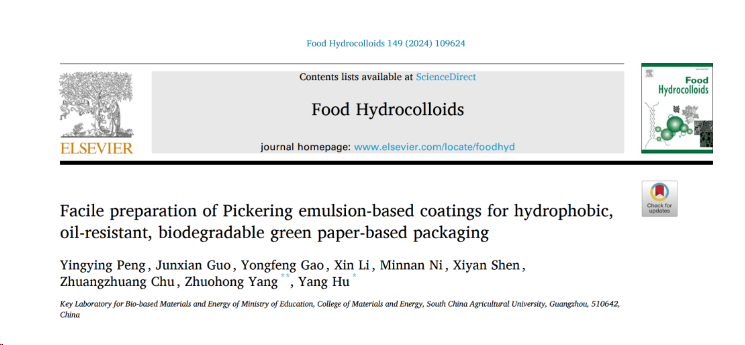 为开发应用广泛的纸基食品包装材料,华南农业大学材料与能源学院生物基功能高分子材料研究团队开发了基于纤维素纳米晶、聚乳酸、壳聚糖、糯米淀粉构建的生物基皮克林乳液涂料,通过在纸表面一步涂层便捷有效的构建了疏水阻油的涂层纸,优化后的涂层纸不仅具有良好的疏水阻油性、增强的力学性能,还具有防污自清洁性、可生物降解性、便捷回收性及再加工性,在食品包装领域展现出良好的应用潜力。相关研究成果以“Facile preparation of Pickering emulsion-based coatings for hydrophobic, oil-resistant, biodegradable green paper-based packaging”为题在国际知名期刊《Food Hydrocolloids》(中科院一区Top,IF 2023 = 10.7)上发表,论文的第一作者为团队2021级硕士研究生彭影影,通讯作者为胡洋副教授、杨卓鸿教授,该研究得到了广东省科技计划、顺德区科技计划和中国博士后科学基金等项目的支持。该研究将皮克林乳液与全生物基涂料相结合,为制备疏水、阻油、可重复使用的多功能包装纸提供了一种绿色、可持续、低成本的策略。