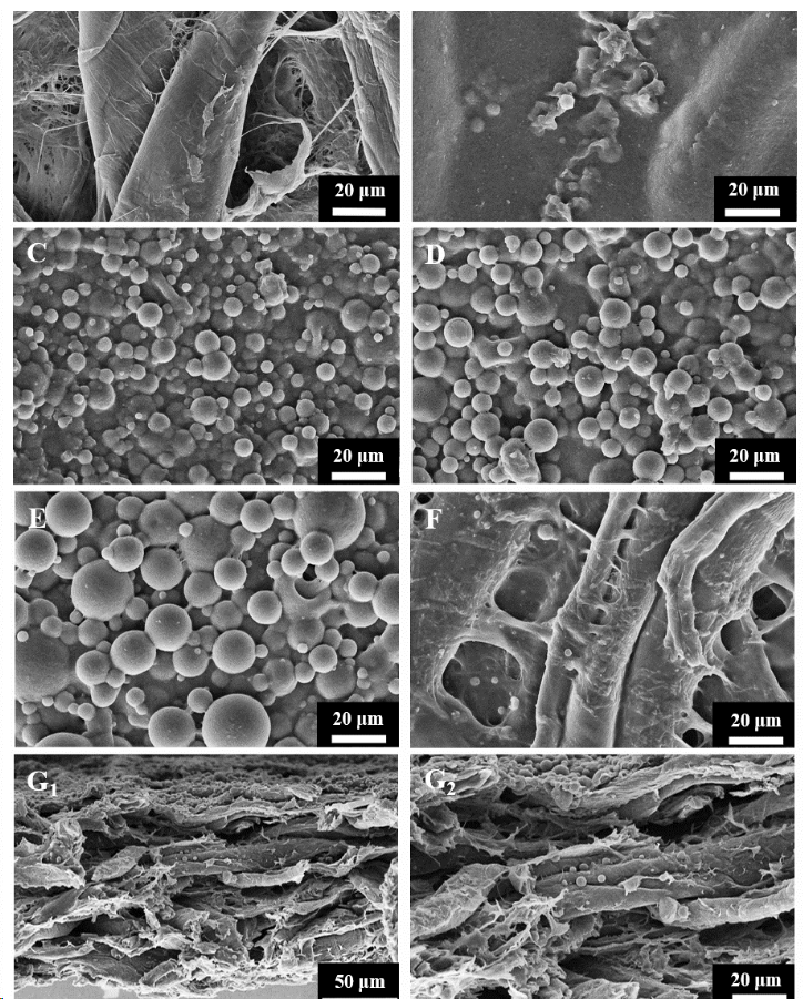 图2原始纸和涂层纸表面SEM图:(A)U-CP、(B)PE0-CP、(C)PE4-CP、(D)PE8-CP、(E)PE12-CP和(F)TE-CP纸。(G1,G2)PE8-CP纸的横截面SEM图。