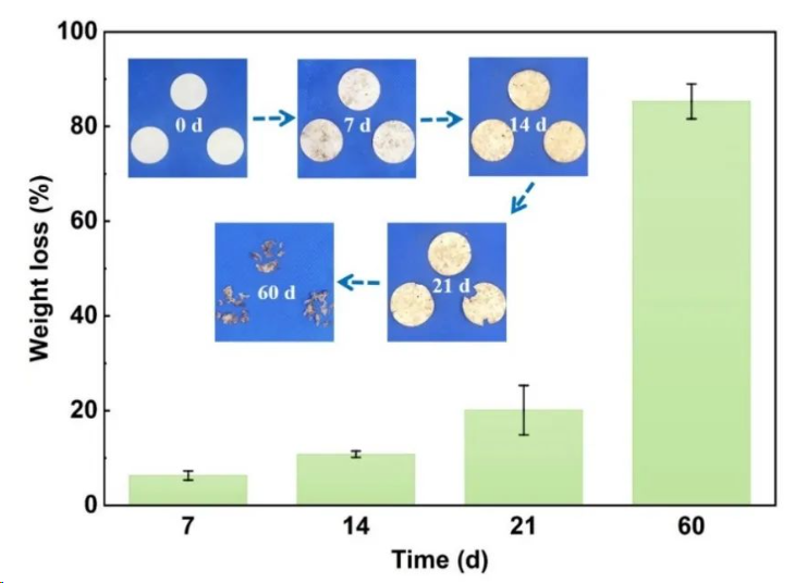 图7 PE8-CP纸在土埋60天期间的重量损失率(降解情况)。插图显示了PE8-CP纸在土壤埋置7、14、21和60天后的外观形态。