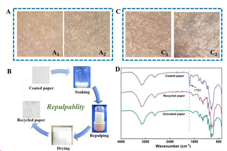 图8PE 8-CP纸在去除涂层(Al)之前和(A2)之后的光学显微镜照片;(B)涂层纸的回收过程;(Cl)原始纸和(C2)回收纸的光学显微镜照片;(D)涂层纸、原始纸和回收纸的FTIR光谱。