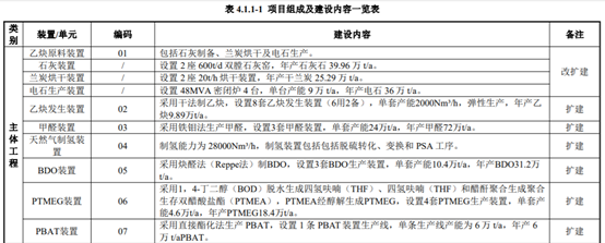 主要建设36万吨/年乙炔原料装置、12万吨/年乙炔发生装置、28000标立方米/小时天然气制氢装置、72万吨/年甲醛装置、31.2万吨/年BDO装置(三套装置产能为3×10.4万吨/年)、18.4万吨/年PTMEG装置(四套装置产能为4×4.6万吨/年)、6万吨/年PBAT装置等。