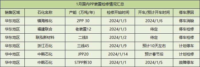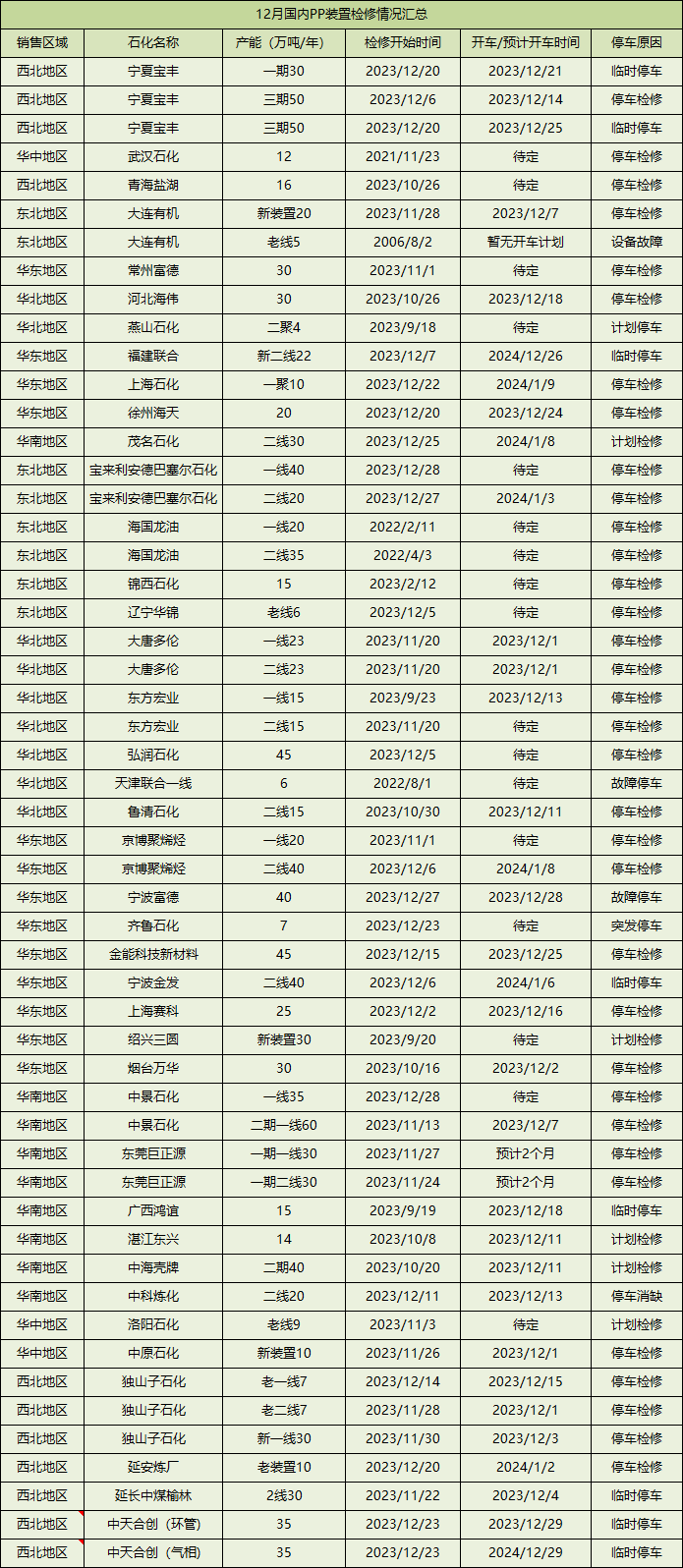 12月份PP装置检修密集,共计40家生产厂家、53条生产线停车检修,涉及产能约1301万吨/年。