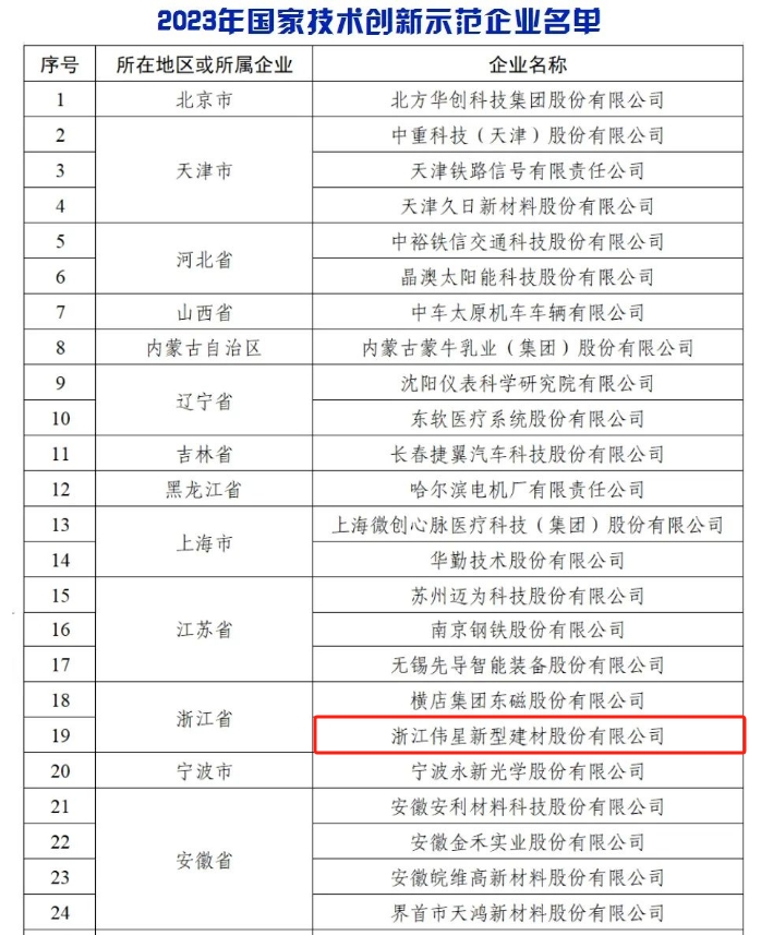 2024年1月17日,工业和信息化部办公厅公布2023年国家技术创新示范企业名单,浙江伟星新型建材股份有限公司入选.