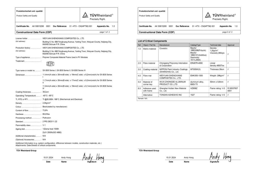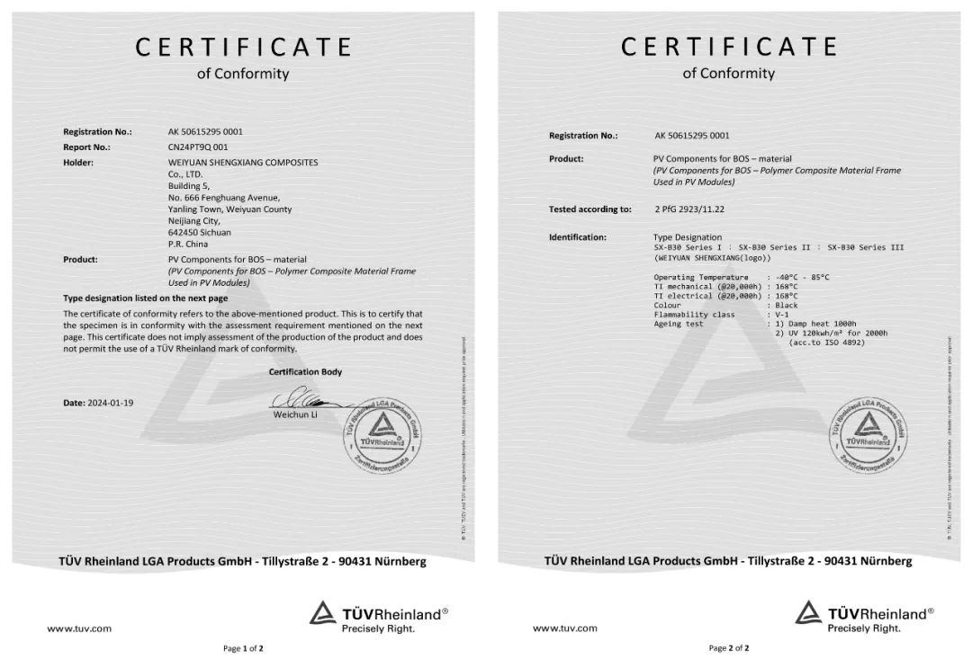 本次认证的系列聚氨酯光伏边框产品,通过了德国莱茵TÜV 公司2PfG2923标准认证,在耐老化测试、阻燃性能、力学性能、耐盐雾测试等全周期测试中表现优异,该证书的获得是对威远盛祥复合材料有限公司高质量制造能力的认可。