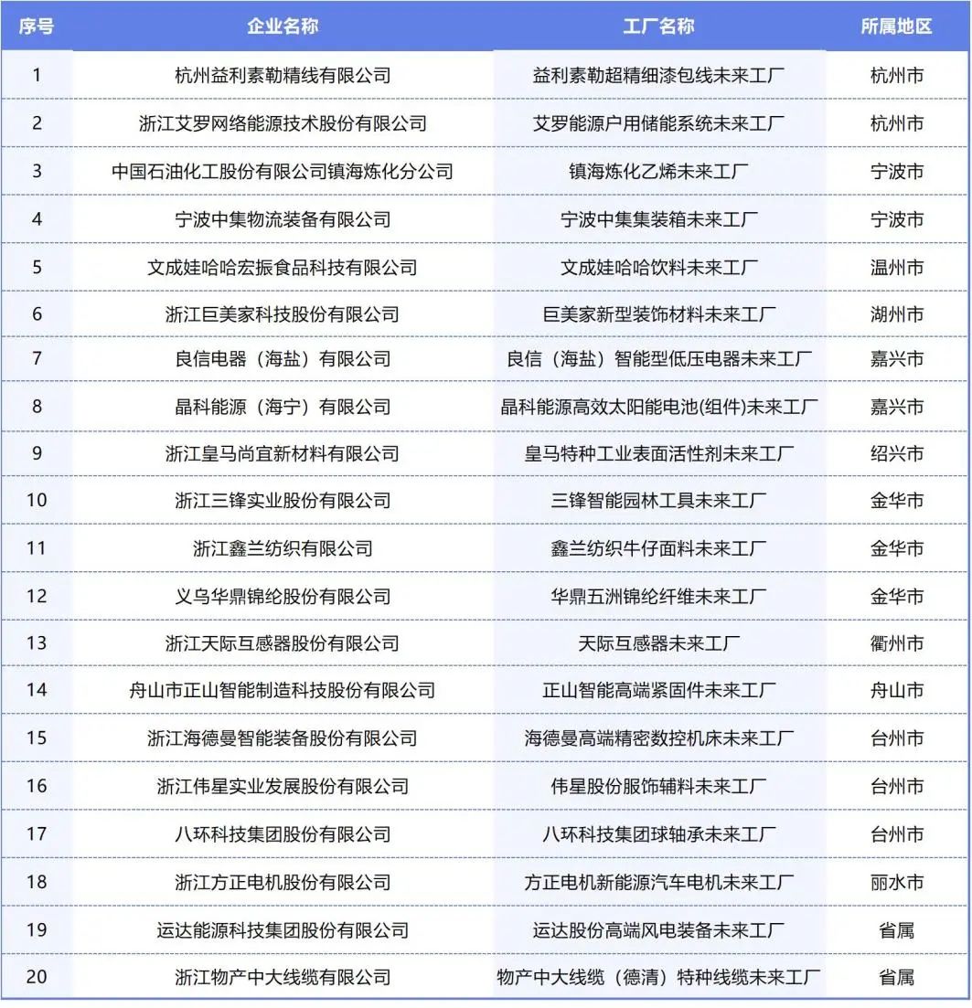 根据《关于开展2023年浙江省未来工厂和智能工厂(数字化车间)评定及首批复评工作的通知》,经企业自主申报、地方推荐和专家现场评估,经研究确定“益利素勒超精细漆包线未来工厂”等20家工厂为浙江省未来工厂,现将名单予以公布。