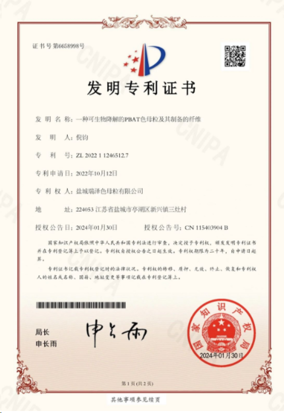 该专利的获得不仅体现了盐城瑞泽色母粒有限公司在科技创新能力方面的持续提升,同时也展现了公司在可生物降解领域取得的显著成果。这一重要进展对于推动生态可持续发展具有重要意义,进一步彰显了公司的环保理念和社会责任。