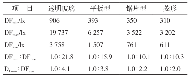从下表可以看出:透明玻璃与平板型PC板不满足DFmin∶DFave<1.0∶3.0的要求,使用透明玻璃和平板型PC板采光顶,日光直射并且强烈,室内容易发生眩光和眩目。而使用锯片型和菱形PC板采光顶时,日光照射缓和,室内视觉环境舒适。锯片型和菱形PC板适用于顶光建筑采光。