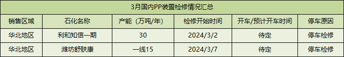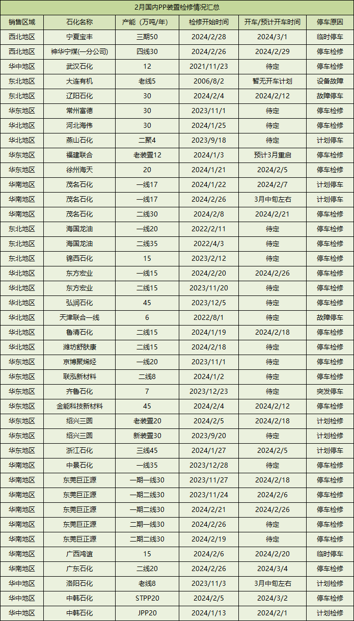 2月份PP石化企业检修意愿降低,共计30家生产厂家、40条生产线停车检修,涉及产能约911万吨/年。