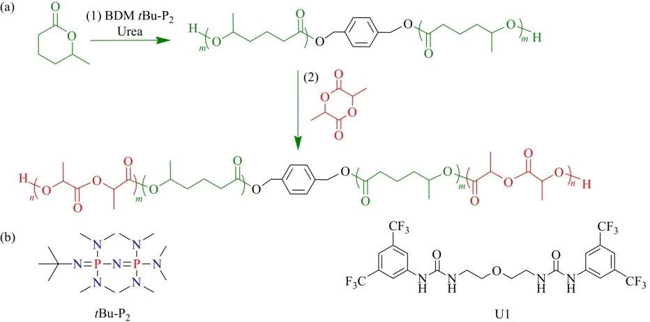 热塑性弹性体(TPE)具有热塑性塑料的可重复加工性质以及传统橡胶材料的柔韧性和高弹性,广泛应用于压敏黏合剂(PSA)、汽车零部件、医疗器械等领域。目前最常见的商品化热塑性弹性体为聚苯乙烯型三嵌段共聚物,它们性优价廉但来源于不可再生的石油资源,这些聚合物主链具有稳定的碳-碳结构,在自然环境下无法降解,导致严重的资源短缺和环境污染问题。发展可再生、可降解脂肪族热塑性弹性体有望部分替代目前广泛使用的聚苯乙烯型热塑性弹性体材料,对于解决塑料污染问题具有重要意义。但目前报道的完全可降解热塑性弹性体较少,而且它们使用的单体合成步骤复杂、耗时、成本高,利用商品化生物基单体为原料制备可降解热塑性弹性体有望解决上述挑战。