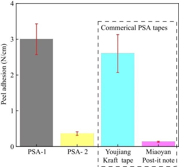 图4 该工作中制备的PSA与商用PSA的180°剥离试验结果比较