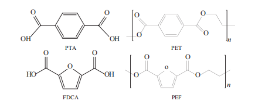 聚2,5呋喃二甲酸乙二酯(PEF)是以木质纤维素为基础原料制备的生物基聚酯。其原材料2,5呋二甲酸(FDCA)早已在2004年就被评为最具潜力的12种生物基平台化合物之一。由于FDCA 与对苯二甲酸(PTA)具有相似的环状共轭双羟基的结构,如图1所示,所以两者化学性质也近似。PEF也被大部分学者视为PET的完美替代品。同时,与石油产品 PET不同的是,PEF可以100%基于生物技术生产,并在关键应用中增强可循环使用性,并且由于它完全基于生物基础,可以有效减少二氧化碳的排放。其与PET相比可降低温室气体排放量达到50%以上。