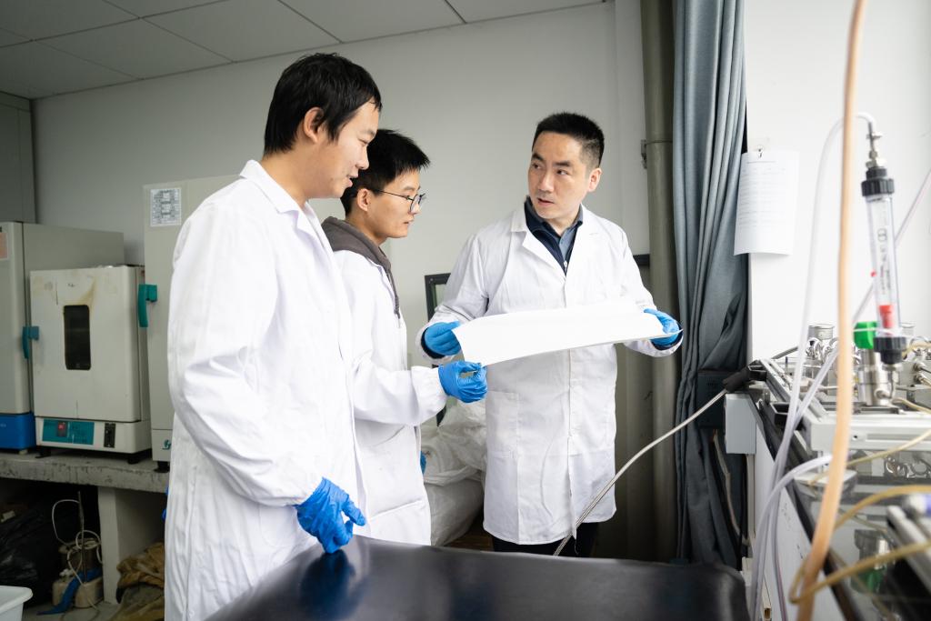 4月17日,南京理工大学环境与生物工程学院张轩教授(右)和学生研究新型聚酯反渗透膜。