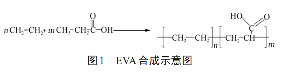 EVA由乙烯单体和醋酸乙烯单体共聚而成,其合成过程如图1所示。由于醋VA的引入,打乱了聚乙烯分子的规整性,导致整个分子的结晶度下降,极性增加,使EVA的耐环境应力开裂性、与填料的相容性、辐照交联性、耐油性能、反复弯曲性能都得到提高;但是EVA的拉伸强度、硬度、熔点和电绝缘性能则随之下降,同时耐空气和水蒸气的渗透性变差。