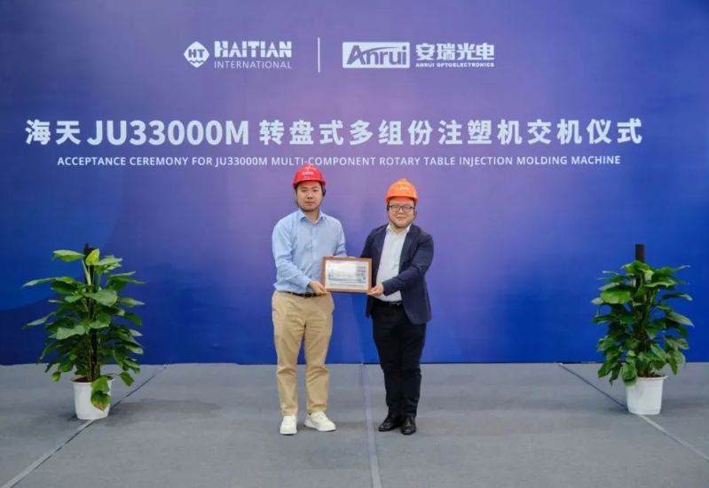海天集团常务副总裁张斌、安徽芜湖安瑞光电总经理孙玉宝、成都安瑞光电总经理成东风、海天塑机多组份产品线副总经理高杰林、安徽芜湖安瑞光电采购部长邵春雷、海天塑机产品开发部戴国平经理等双方领导出席交付仪式,共同见证这一重要时刻。
