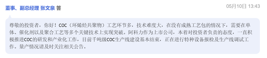 5月10日,阿科力在其业绩说明会上表示:目前公司COC聚合物千吨级生产线建设基本结束, 正在进行特种设备报检及生产线调试工作,产业化突破在即。