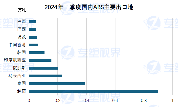 2024年一季度ABS出口按产销国来看,东南亚为主要出口地,排名前三的为越南,泰国,马来西亚,三个国家总出口量在152万吨,占总出口量的40.64%;近年来,国内ABS出口贸易伙伴愈发分散,越南、泰国、俄罗斯、印度尼西亚、马来西亚等周边国家地区是国内ABS的主要出口地。其中,对越南、俄罗斯ABS出口量不断增长,伴随其区域经济不断发展,对ABS的需求日益增长.而中国一季度对土耳其出口总量在0.0021万吨,占总出口量的0.06%,整体看对ABS出口基本无影响。