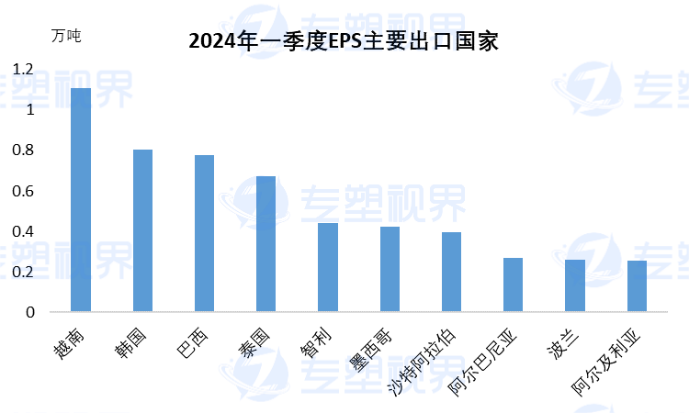 而从2024年一季度的出口数据来看, 1季度中国EPS出口量为7.95万吨,同比增幅11.10%。从出口国家来看,越南、韩国、巴西、泰国、智利位居前五位,其中越南约1.106万吨,占比13.92%,韩国0.805万吨,占比10.13%,巴西0.775万吨,占比9.75%,泰国0.675万吨,占比8.49%,智利0.443万吨,占比5.57%,上述五个贸易伙伴出口量占总量47.85%。而一季度中国出口到土耳其的EPS仅有0.048万吨,占出口总量的0.6%,整体来看不管土耳其对EPS是否有反倾销,对中国市场影响较小。