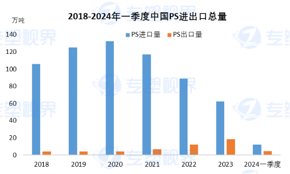 同样随着国产料品质提升,国内PS出口从2021年开始也在逐年上升,到2023年出口量达到18.59万吨,创近6年新高,2024年在国内产量充足情况下,PS出口有望保持增长态势。