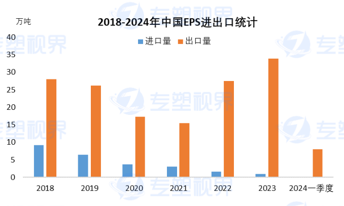 对外贸易方面,国内EPS以出口为主,进口较少。根据中国海关总署数据,2023年中国EPS进口量为0.96万吨,同比下降39.68%;出口量为33.91万吨,同比增长23.48%。随着近年来国内EPS市场产能增加,进口量逐年下滑,而出口量从2021年开始持续上升。