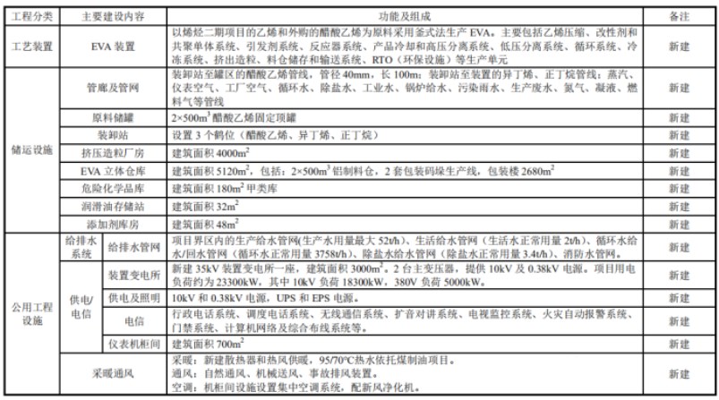 建设内容:包括10万吨/年EVA装置及配套的公用工程、储运工程和辅助设施、环保工程等,项目部分公用工程依托宁煤烯烃二期项目和煤制油项目。