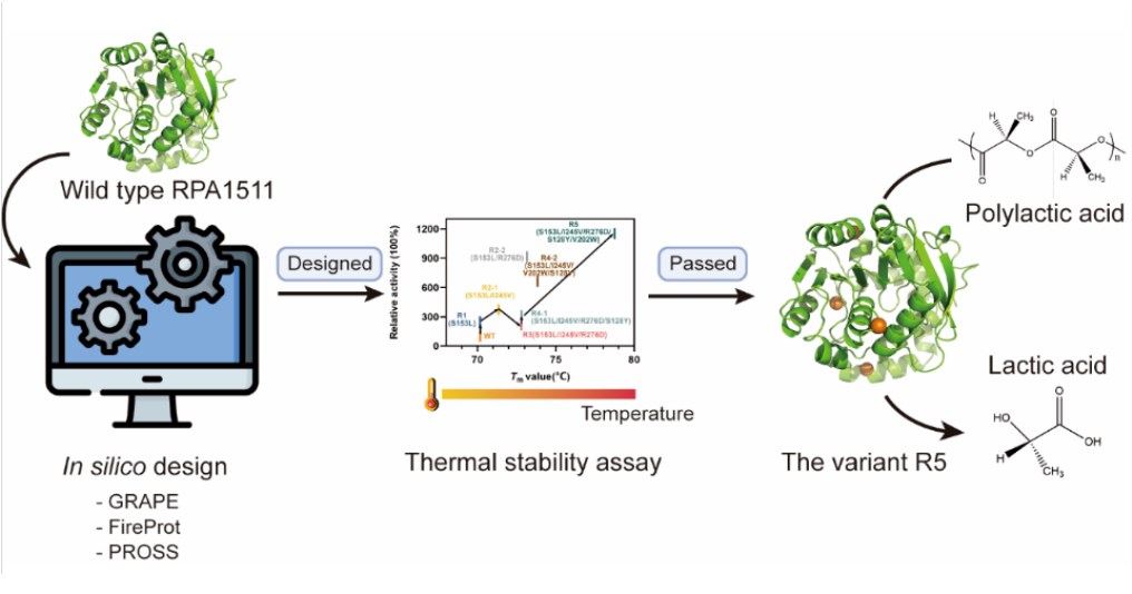 近日,南京工业大学姜岷教授团队通过筛选,以来源于红假单胞菌(Rhodopseudomonas palustris)中的酯酶RPA1511为研究对象,通过组合多种酶热稳定性的计算设计工具,结合湿实验与干实验,确定了7个有益的单点突变位点。进一步通过组合迭代突变,获得一个性能最优的突变体R5。与野生型相比,突变体R5的热变性温度(Tm)提高了8℃,比酶活性提高了11.5倍。同时,该变体在65℃下72 h内可将85%的固体PLA解聚为乳酸单体,是野生型RPA1511的3.3倍。最后,结合分子动力学模拟,发现突变体R5中的S153L/I245V/R276D/S128Y四个氨基酸残基的突变有利于蛋白质热稳定的提高,而V202W位点的突变通过氢键和疏水堆积,增加了酶与底物的相互作用,增强底物在活性口袋中催化构象定位,进而有利于催化活性的提高。这种通过计算设计的综合方法产生了一种高催化活性和热稳定性的PLA解聚酶,有望促进PLA的生物回收过程。
