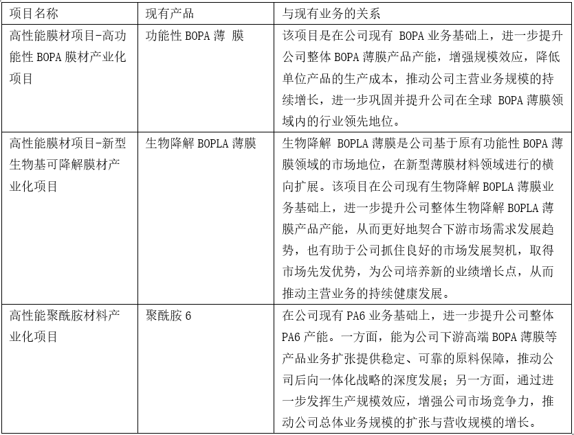 公司自成立以来,专注于功能性 BOPA薄膜、生物降解 BOPLA薄膜及相关材料产品的研发、生产和销售。公司募集资金投资项目均是在现有主营业务的基础上进行技术改造,同时结合行业发展趋势和市场需求状况扩大业务规模、提升市场营销能力和公司综合竞争力。