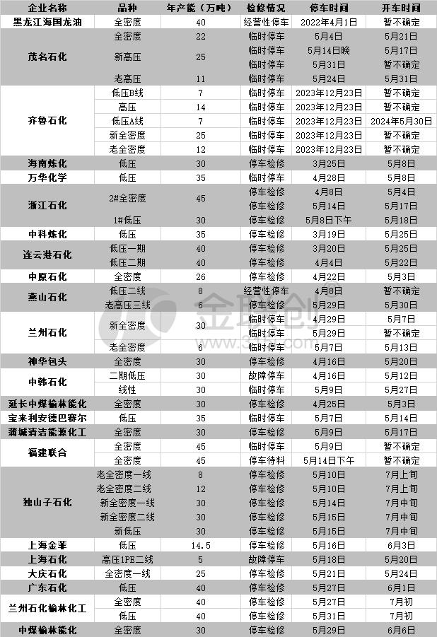 从上表可以看出,5月份,海南炼化低压、万华化学低压、连云港石化低压、中原石化全密度、神华包头全密度、中韩石化二期低压、中煤榆林能化全密度装置已经完成前期检修并重启;茂名石化全密度/老高压、浙江石化2#全密度/1#低压、燕山石化老高压三线、兰州石化老全密度、中韩石化线性、宝来利安德巴赛尔低压、蒲城清洁能源全密度、上海石化高压1PE二线、大庆石化全密度一线装置临停后已重启;福建联合全密度、独山子石化全线、上海金菲低压、兰州石化榆林化工全密度/低压、中煤榆林能化全密度装置停车检修;黑龙江海国龙油全密度、齐鲁石化低压B线/全密度/高压、燕山石化低压二线装置仍处于停车检修状态。