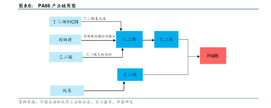 己二腈主要用于生产尼龙66、尼龙610、HDI等产品。己二腈氢化生成己二胺,尼龙66是己二胺最主要的下游应用领域。