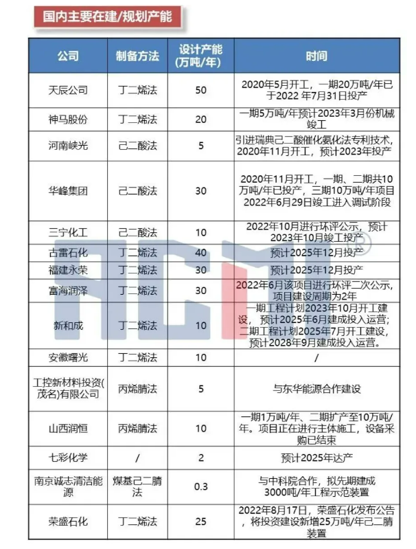 据不完全统计,截至2022年7月,中国己二腈在建及拟建产能合计277.3万吨/年,如下所示: