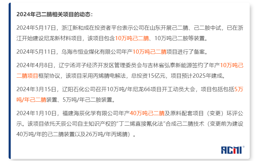 2024年5月17日,浙江新和成在投资者平台表示公司在山东开展己二腈、己二胺中试,已在浙江开始建设尼龙新材料项目,该项目包含10万吨己二腈、10万吨己二胺等装置。
