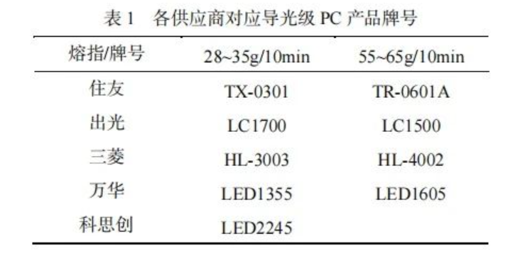 LED车灯的导光条材料一般选用具有优异透光性能的聚碳酸酯(PC)或聚甲基丙烯酸甲酯(PMMA)。相较于 PMMA,PC具有更优异的抗冲击及耐热性能,因而在LED车灯的厚壁导光板、导光条、透镜等部件中应用更为广泛。目前,导光级 PC 的主要供应商为住友、出光、三菱和科思创等国外企业,国产PC供应商中万华可以生产。为满足车灯复杂结构设计的需要,车灯用导光 PC 的熔指一般分为 28~35 和 55~65g/10min 两种,表 1为各供应商对应导光级 PC 产品牌号。
