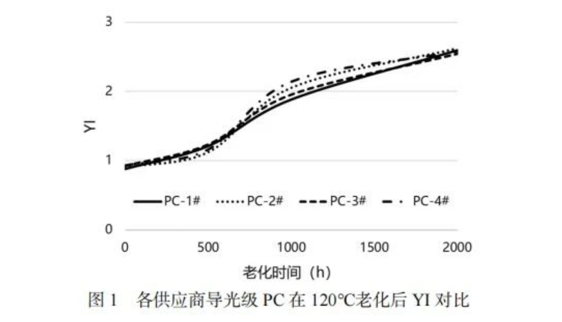 表2和表3是各供应商导光级 PC 产品在相同加工条件下 3mm 试片的颜色、透光率、雾度、熔指和力学性能的对比结果。图 1 是各供应商导光级 PC 产品在 120℃热氧老化 500、1000、2000h 后 YI (黄色指数)的对比结果。