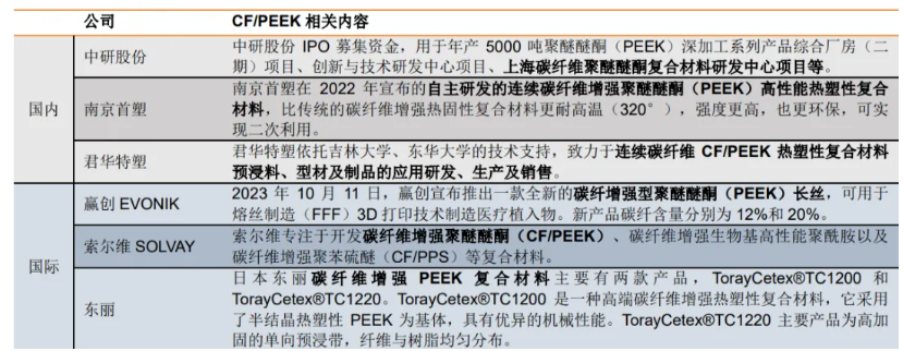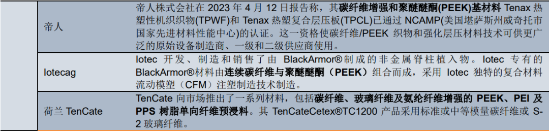 碳纤维增强的PEEK复合材料可用于制造骨科植入物、脊柱融合器、椎体间融合装置和骨固定板等,与金属植入物相比具有更优异的机械性能、耐磨性、耐化学性、良好的生物相容性、接近人体骨骼的弹性模量等优势。全球知名的生产企业有赢创、Invibio、帝人、Icotec、威格斯和索尔维等,其中Invibio是世界上首家推出医疗级短纤增强PEEK复合材料的企业。