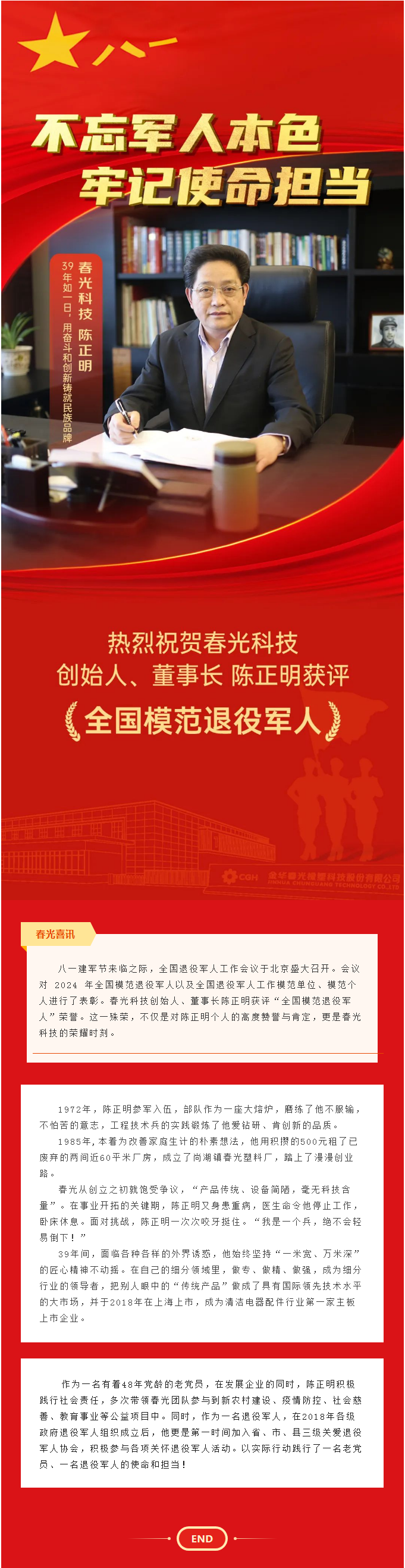 金华春光橡塑科技股份有限公司董事长陈正明获“全国模范退役军人”荣誉称号