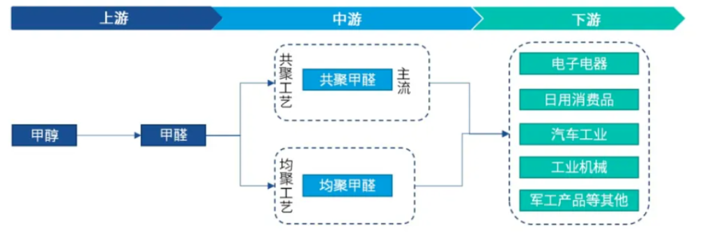 POM产业链上游原料为甲醇,中游POM产品按结构可分为均聚POM和共聚POM两大类,产业链下游主要为棒材、管材以及配件等,并可应用到电子电器、日用消费品(主要是服装拉锁)、汽车工业、工业机械等领域。