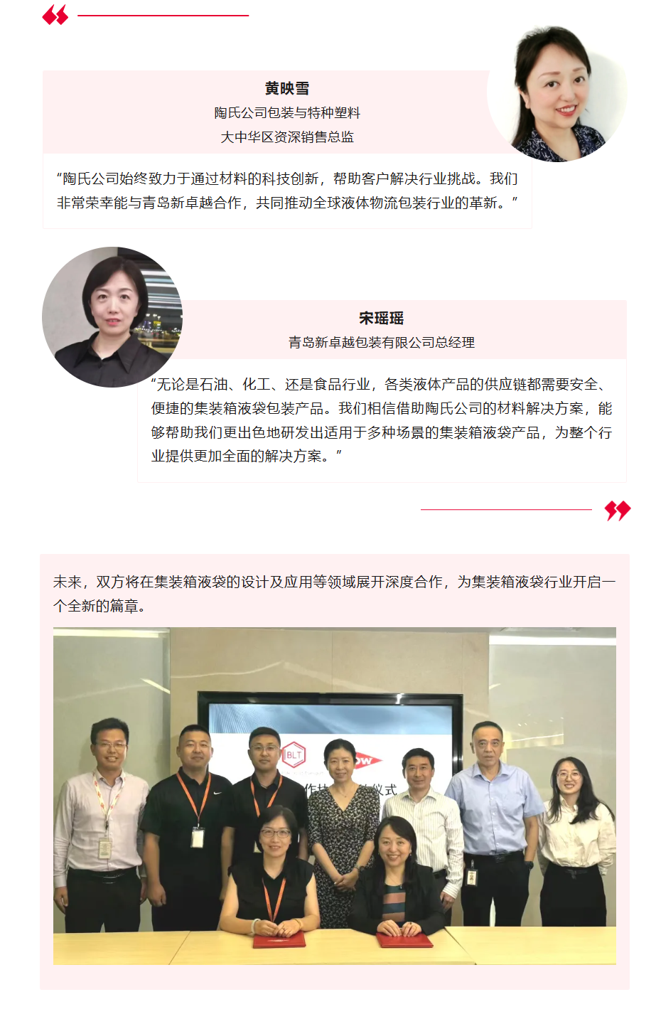 9月3日,全球领先的材料科学公司陶氏公司(纽交所代码: DOW)与专注于高品质集装箱液袋设计研发与生产的制造商青岛新卓越包装有限公司(BLT),在上海陶氏公司包装大师中心(Pack Studios)举行战略合作签约仪式,并签署了战略合作谅解备忘录。未来,双方将共同推动集装箱液袋产品的优化与升级,为全球集装箱液体运输行业带来更加可靠和更高品质的解决方案。