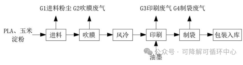 1)进料:人工将外购的PLA与玉米淀粉的混合原料吨袋口对准投料口投至原料仓内,原料通过料仓底部经负压形式真空输送进入自动供料系统。
