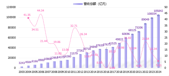 从2024浙江省百强企业的规模特征来看,营业收入方面属于“小步快跑,稳健前行”,2024省百强企业营业收入总额达到105842.26亿元,较上年增长5.81%。其中有31家企业营业收入超过千亿元,比上年增长2家企业,排名前三位的是阿里巴巴(中国)、浙江荣盛控股集团、浙江吉利控股集团。